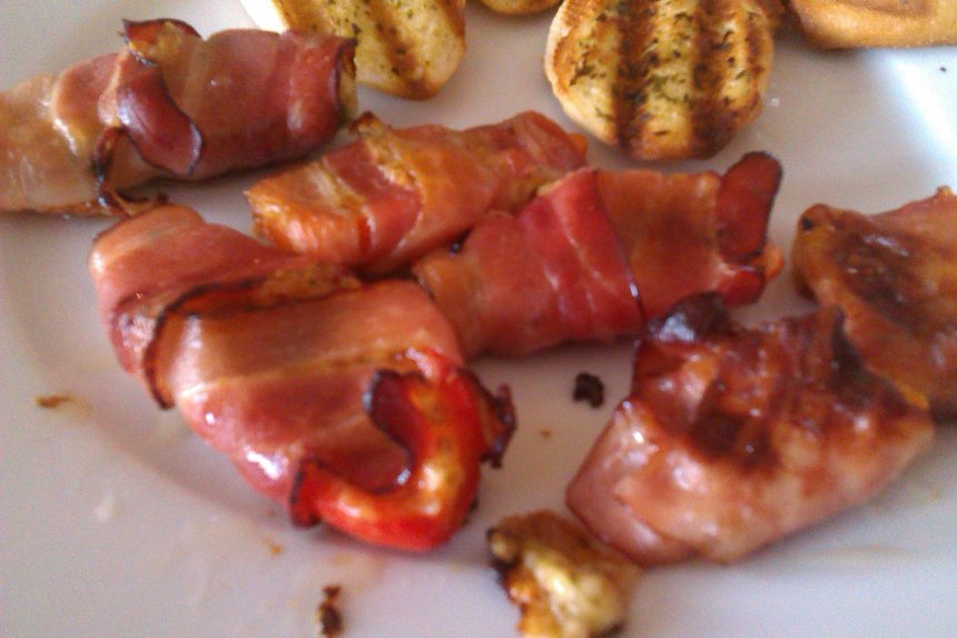 Jalapena plněná směsí cheddaru a uzeného eidamu (+koření) zabalená v anglické, jako příloha bagetky opečené s bylinkovým (medvědí česnek) máslem