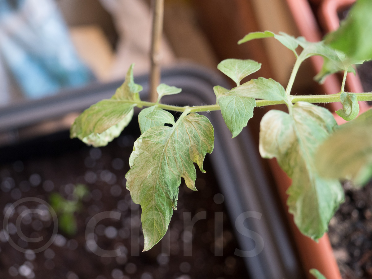 Výsledek nočního vyjasnění a větříku na rajčatech, efektivní teplota byla pod nulou.