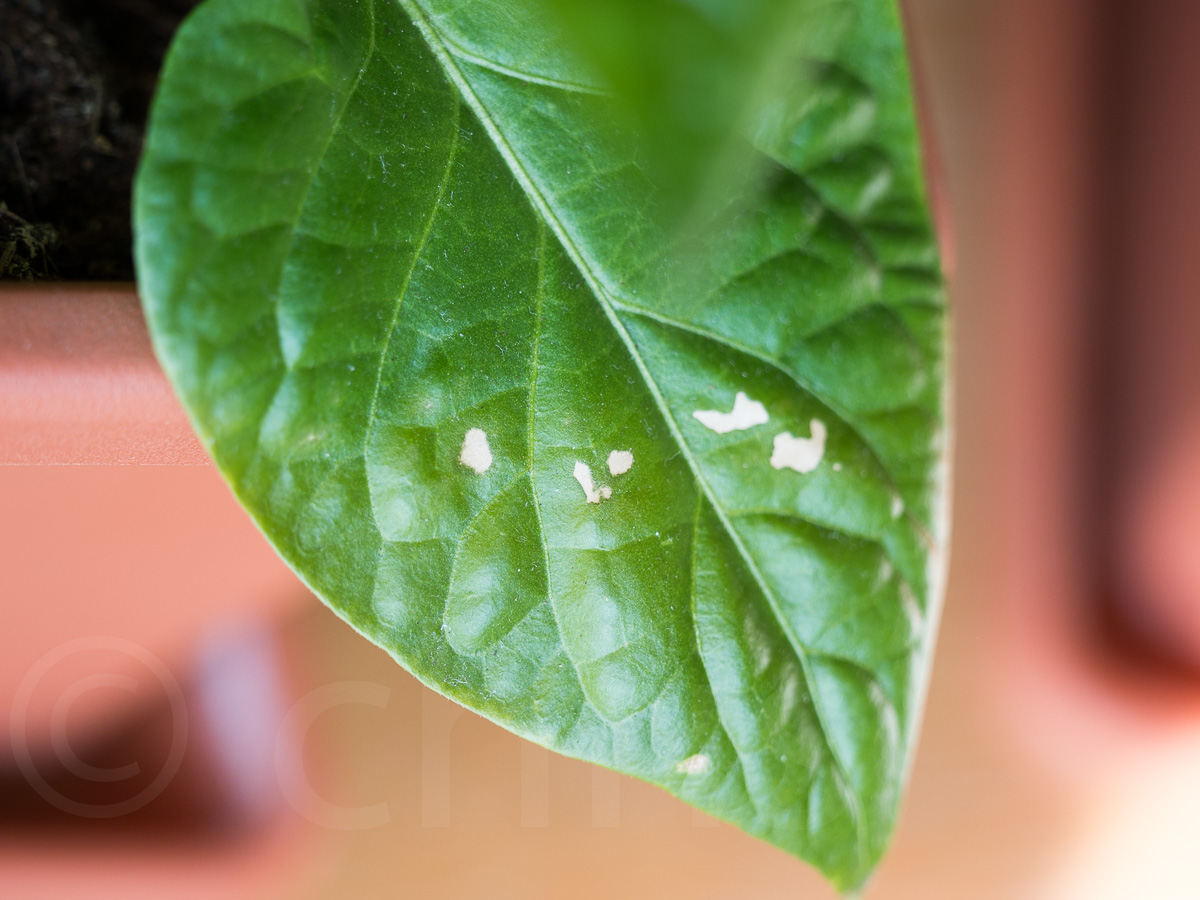 Dorsetka byla na sluníčku trošku déle než měla být, drobné spáleniny v místě dotyku spodního listu s hranou květináče.