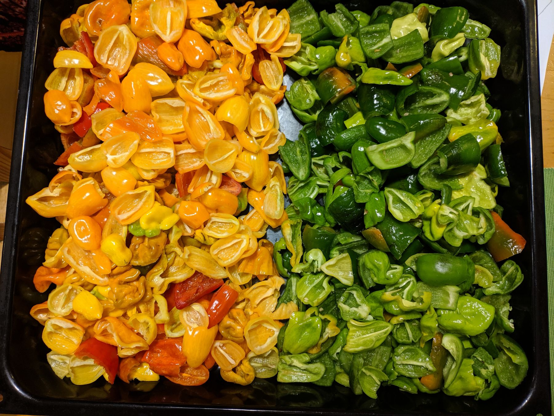 Vykrájené chilli před přípravou omáček. Vesměs chinense, jen vpravo jsou i nějaká nezralá rocota.