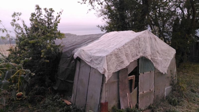 Bylo dnes mrazivé ráno. Asi -3°C. Možná 4. Večer jsem provedl jisté opatření. Přehodil jsem skleník plachtou. Jestli to pomohlo zatím nevím. Ráno to na první pohled nevypadalo zle, ale ....... ale..........
