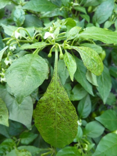 A teď ze smutnějšího soudku. Po těch masivních deštích se mi na některých rostlinách objevila nejspíš plíseň. Nejhůř je na tom druhý exemplář Habanero White. Shazuje listy a květy a tak celkově chřadne. Mají to i některá další habanera a jedna větev Panambi. Co myslíte? Plíseň? Postříkat anebo vyčkat?