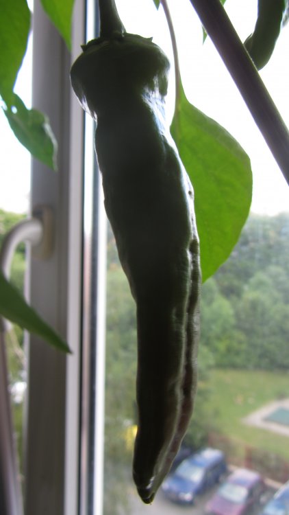 Tohle mi vylezlo ze semen jež byla popsána jako Jamaican red Hot,poté co jsem prolezl web si myslím že to bude něco z rodiny Aji.Plody jsou 7-9cm dlohé,2měsíce byli zelené ted začínají tmavnout.Celá rostlina na dalsí fotce.