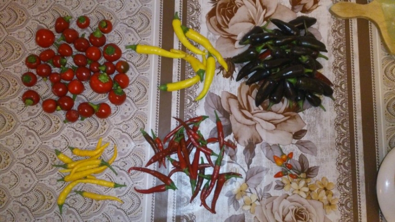 feferonky a dajake dlhe chilli, Lemondrop, Cayenne Golden, Jalapeno Purplle a par kuskov Bolivian Rainbow /ktore isli do obeda/, celkovo to bolo 880 g chilli