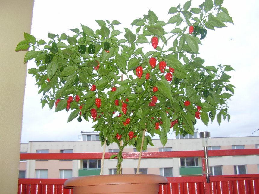 Naklíčení od poloviny ledna. Sazeničky v bytě pod CFL lampou. Po "zmrzlejch"na balkoně na východní stranu v květináči o průměru 50 cm. Zemina obyčejný zahradnický substrát + chilli focus dle návodu. Výška cca 70 cm, průměr cca 125 cm. Počet plodů???(stovka jich tam bude)