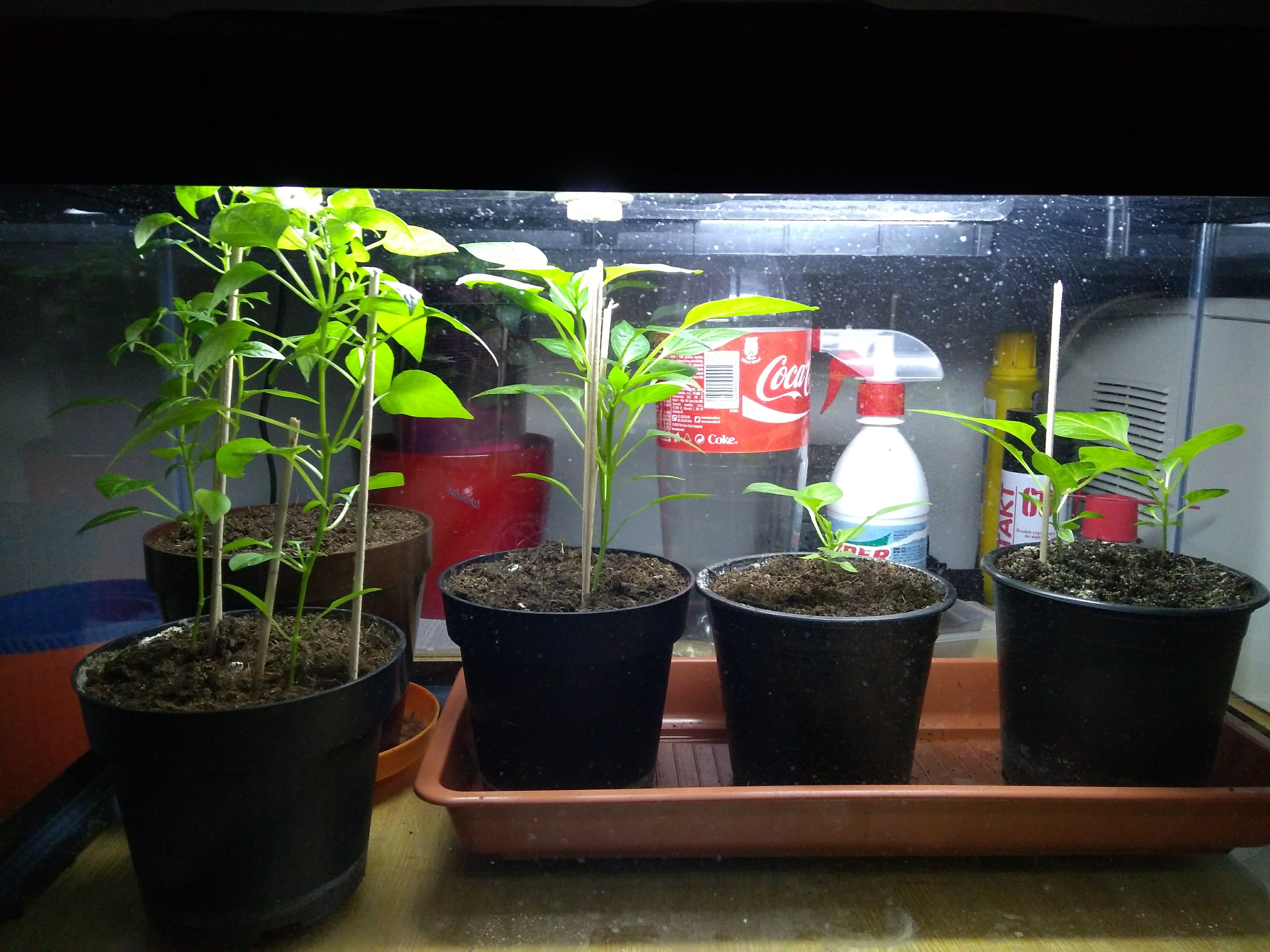 Keďže som sadil v novembri, nechal som rastlinky pod umelým osvetlením 12 hodín denne. Naľavo asi Red Demon, v strede Jalapenos a napravo Trinidad Moruga Scorpion. Aj napriek svetlu a teplu sa vytiahli vysoko tak som ich musel podoprieť. Nabudúce skúsim znížiť teplotu len na úroveň okolo 20 stupňov.