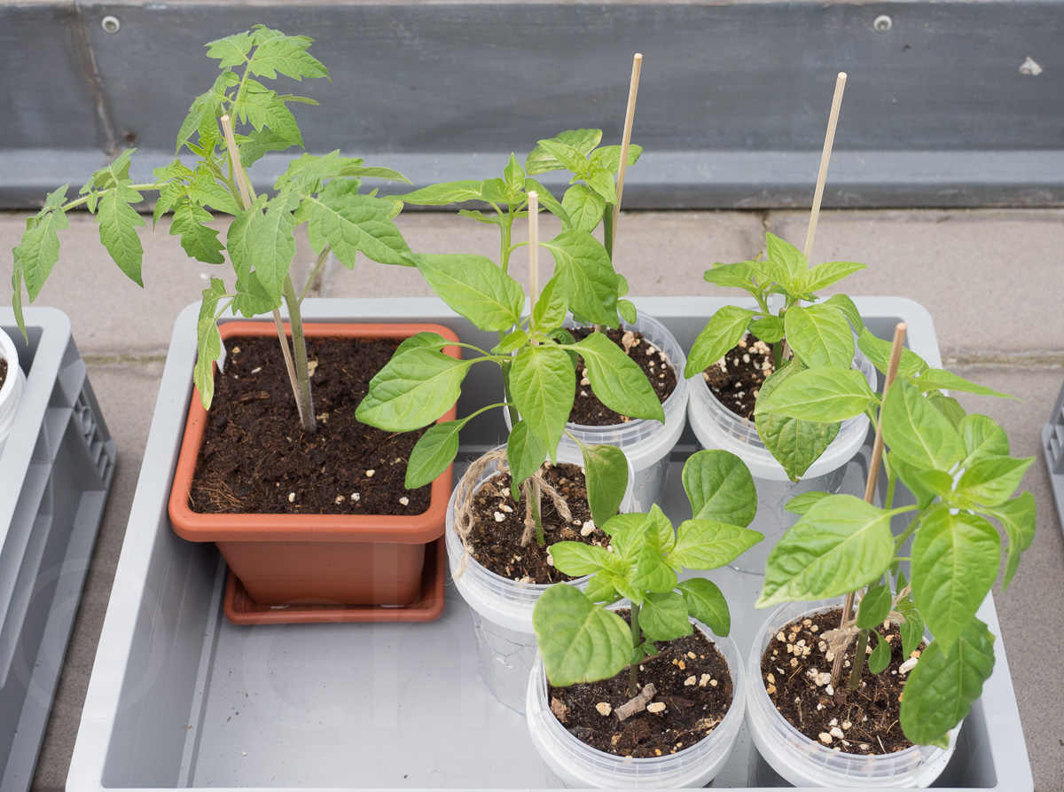 Ajiny a první přesazené rajče.