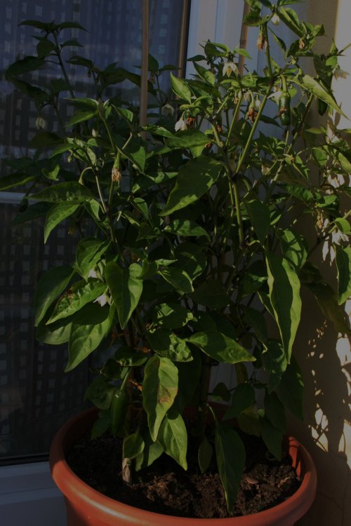 První fotka je Jalapeňo, šly hned po "zmrzlejch" na balkón a osvědčilo se to, po popálení sluníčkem se vzpamatovali, rostou jak o medaile (60 cm), kvetou, nasazujou plody. Jedna kytka je zastřihnutá, druhá bez zásahu, nevidím výrazný rozdíl, jen ta zastřihnutá má o něco silnější kmínek.