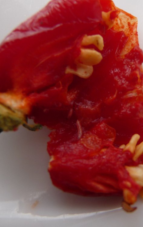 Přikládám několik obrázků "červíků", které jsem nalezl v poškozeném plodu chilli. Červíci jsou 2-3 mm dlouzí a evidentně jim chutná dužina. Znáte to někdo?