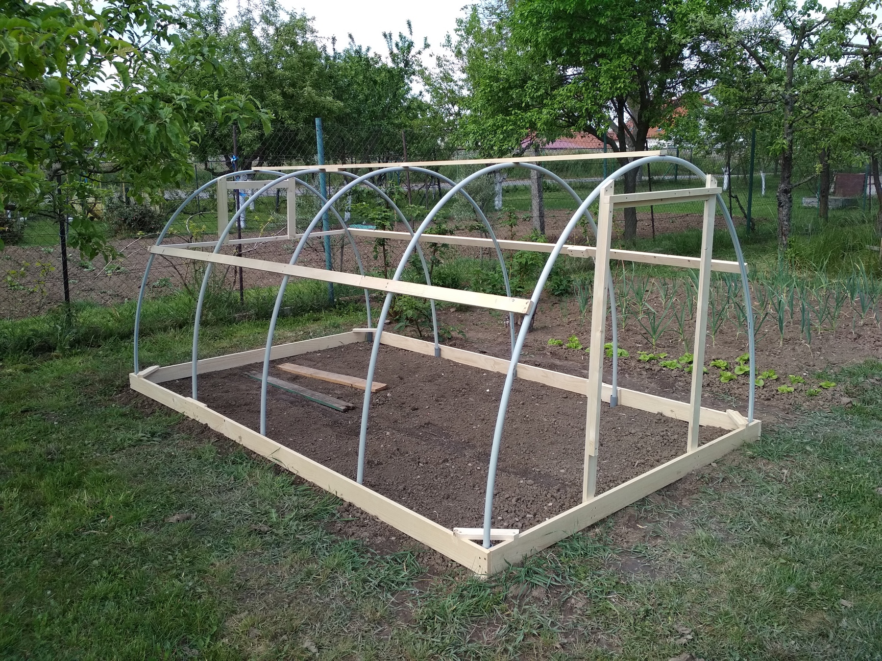 Základnu tvoří jen desky šířky cca 14cm o tlouštce cca 2cm...dají se sehnat v délká 2-4m.Nosný rám je z instalatérských plastových trubek pr. 25mm(bohužel jsem nemohl prevést delší jak 4m čímž byla ovlivněna šířka a výška foliáku.Uchytky folie jsou z inst. plastové trubky pr.32mm-rozříznuté podélně(dnes bych to řešil zahradní hadicí-neroztrhne folii).Zbytek je snad už jasný z obrázků dále....