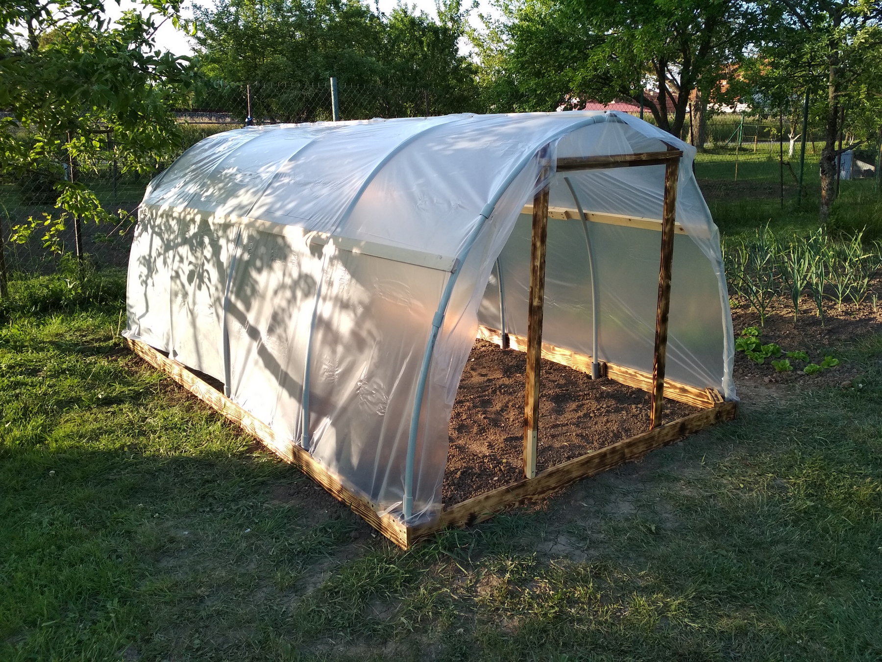 Základnu tvoří jen desky šířky cca 14cm o tlouštce cca 2cm...dají se sehnat v délká 2-4m.Nosný rám je z instalatérských plastových trubek pr. 25mm(bohužel jsem nemohl prevést delší jak 4m čímž byla ovlivněna šířka a výška foliáku.Uchytky folie jsou z inst. plastové trubky pr.32mm-rozříznuté podélně(dnes bych to řešil zahradní hadicí-neroztrhne folii).Zbytek je snad už jasný z obrázků dále....