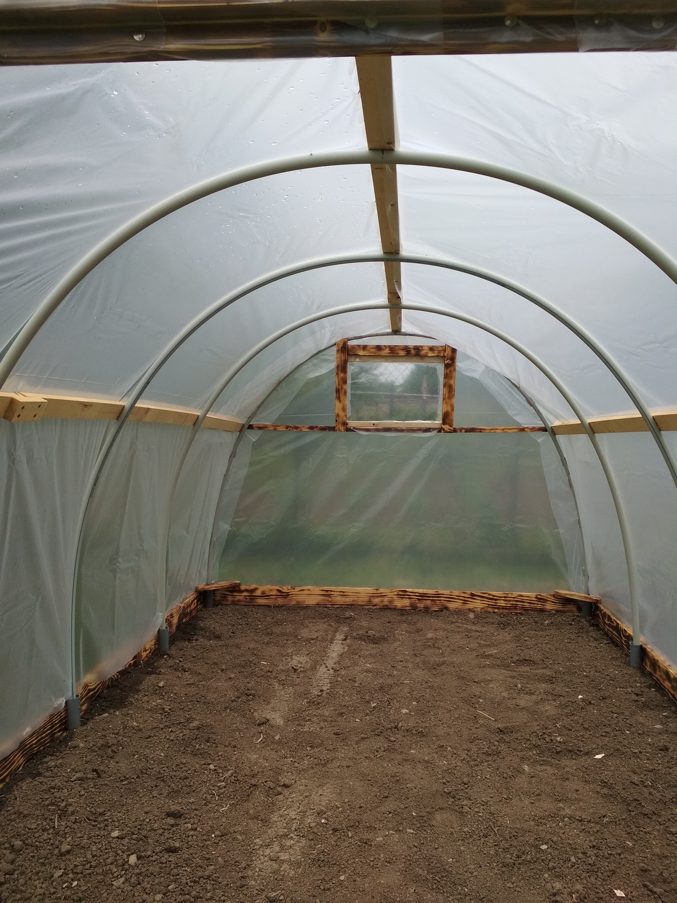 Základnu tvoří jen desky šířky cca 14cm o tlouštce cca 2cm...dají se sehnat v délká 2-4m.Nosný rám je z instalatérských plastových trubek pr. 25mm(bohužel jsem nemohl prevést delší jak 4m čímž byla ovlivněna šířka a výška foliáku.Uchytky folie jsou z inst. plastové trubky pr.32mm-rozříznuté podélně(dnes bych to řešil zahradní hadicí-neroztrhne folii).Zbytek je snad už jasný z obrázků dále....