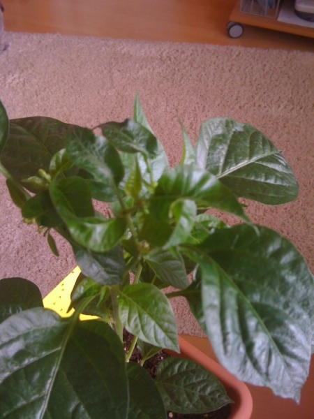 K druhému problému. Moje okrasné chilli, neviem presný druh - semienka som mal od babky, sa pekne rozvetvili. No nové lístky na vetvách majú divný tvar a krútia sa. Rastliny už majú pekných 40cm a sú obsypané pukmi, ktoré som 3 týždne odštipoval a teraz som ich už nechal. Viac na fotkách.