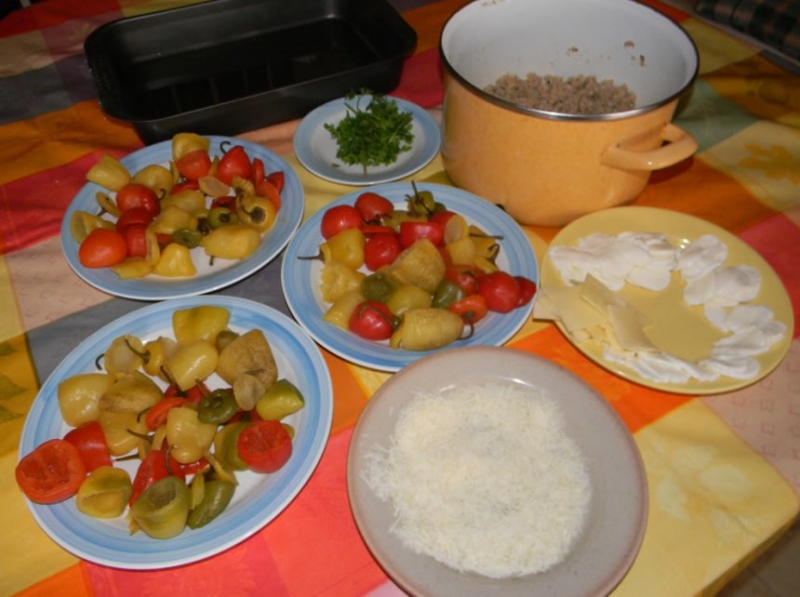 Nahoru pod víko se položí plátek Mozarelly, plátek Eidamu a posypeme parmazánem. Nakonec zaklopíme víko z papričky. A vložíme na pečící plech vymazaný trochou olivového oleje. Z přebytku masové směsi vytvoříme kuličky a dáme je tam také, pokud je místo na pekáči.