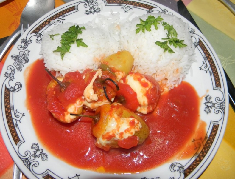 Naplněné papriky přelijeme červenou omáčkou.